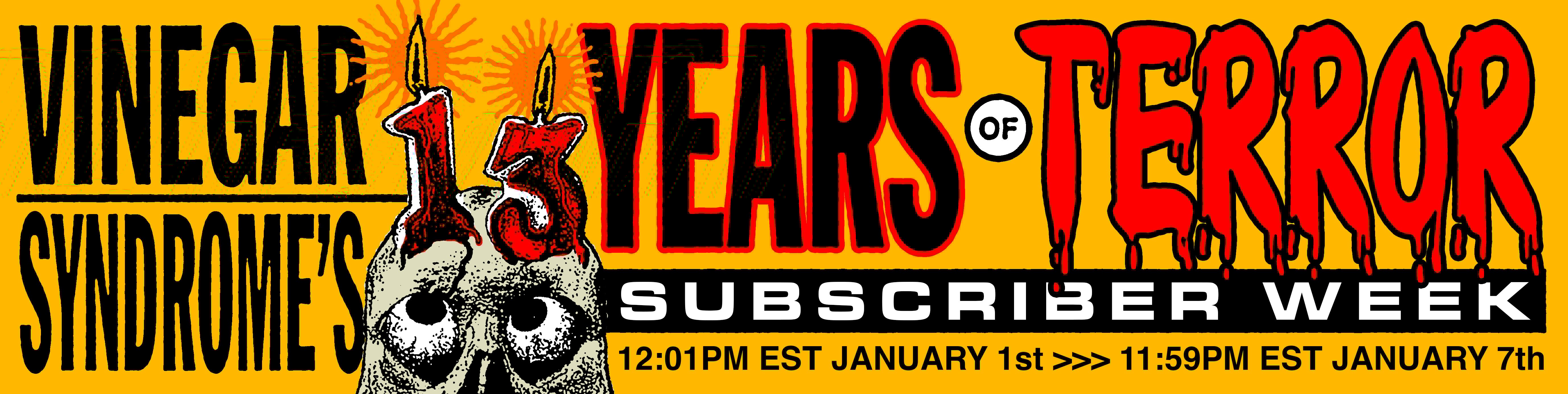 The first seven days of the new year are a celebration of all things Vinegar Syndrome! During this 7-day period, our 2026 Yearly Subscription will be available to purchase, plus we'll have new disc + merch releases, a selection of heavily discounted Daily Deals, new VSMC loyalty products, a punch card campaign to earn extra VSMC points, and a chance to win a free 2026 Subscription!